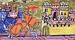 The Crusaders agreed to help Alfonso attack Lisbon, with a solemn agreement that offered to them the pillage of the city's goods and the ransom money for expected prisoners. However, some of the Crusader forces were hesitant to help, remembering a previous failed attempt on the city by a combined force of Portuguese and northern Crusaders during the earlier siege of Lisbon in 1142.[18] The 1147 siege lasted from 1 July to 25 October, when the Moorish rulers agreed to surrender primarily due to hunger within the city. Most of the Crusaders settled in the city, but some of them set sail and continued to the Holy Land.[17] Those who stayed helped to conquer Sintra, Almada, Palmela and Setúbal, and they were allowed to settle in the conquered lands.