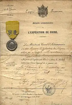 Both Britain (Second China War Medal) and France (Commemorative medal of the 1860 China Expedition) issued campaign medals. The British medal had the following clasps: China 1842, Fatshan 1857, Canton 1857, Taku Forts 1858, Taku Forts 1860, Peking 1860.