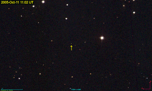 Sedna (provisionally designated 2003 VB12) was discovered by Michael Brown (Caltech), Chad Trujillo (Gemini Observatory), and David Rabinowitz (Yale University) on 14 November 2003. The discovery formed part of a survey begun in 2001 with the Samuel Oschin telescope at Palomar Observatory near San Diego, California, using Yale's 160-megapixel Palomar Quest camera. On that day, an object was observed to move by 4.6 arcseconds over 3.1 hours relative to stars, which indicated that its distance was about 100 AU. Follow-up observations were made in November–December 2003 with the SMARTS (Small and Medium Research Telescope System) at Cerro Tololo Inter-American Observatory in Chile, the Tenagra IV telescope in Nogales, Arizona, and the Keck Observatory on Mauna Kea in Hawaii. Combined with precovery observations taken at the Samuel Oschin telescope in August 2003, and by the Near-Earth Asteroid Tracking consortium in 2001–2002, these observations allowed the accurate determination of its orbit. The calculations showed that the object was moving along a distant and highly eccentric orbit, at a distance of 90.3 AU from the Sun.[19][20] Precovery images have since been found in the Palomar Digitized Sky Survey dating back to 25 September 1990.[2]