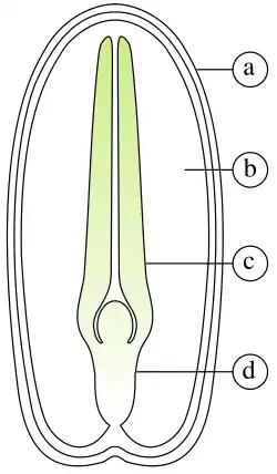 Diagram of the internal structure of a dicot seed and embryo: (a) seed coat, (b) endosperm, (c) cotyledon, (d) hypocotyl