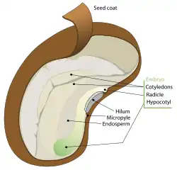 In most monocotyledons (such as grasses and palms) and some (endospermic or albuminous) dicotyledons (such as castor beans) the embryo is embedded in the endosperm (and nucellus), which the seedling will use upon germination. In the non-endospermic dicotyledons the endosperm is absorbed by the embryo as the latter grows within the developing seed, and the cotyledons of the embryo become filled with stored food. At maturity, seeds of these species have no endosperm and are also referred to as exalbuminous seeds. The exalbuminous seeds include the legumes (such as beans and peas), trees such as the oak and walnut, vegetables such as squash and radish, and sunflowers. According to Bewley and Black (1978), Brazil nut storage is in hypocotyl and this place of storage is uncommon among seeds.[18] All gymnosperm seeds are albuminous.