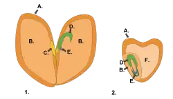 Diagram of a generalized dicot seed (1) versus a generalized monocot seed (2). A. Scutellum B. Cotyledon C. Hilum D. Plumule E. Radicle F. Endosperm