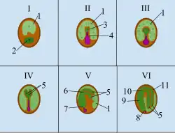 Key: 1. Endosperm 2. Zygote 3. Embryo 4. Suspensor 5. Cotyledons 6. Shoot Apical Meristem 7. Root Apical Meristem 8. Radicle 9. Hypocotyl 10. Epicotyl 11. Seed Coat