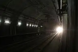 The Seikan Tunnel (Japanese: 青函トンネル, Seikan Tonneru or 青函隧道, Seikan Zuidō) is a 53.85-kilometre (33.5-mile) dual-gauge railway tunnel in Japan, with a 23.3-kilometre (14.5-mile) segment running beneath the seabed of the Tsugaru Strait, which separates Aomori Prefecture on Honshu, Japan's main island, from the northern island of Hokkaido. The tunnel's track level lies approximately 100 metres (330 ft) below the seabed and 240 metres (790 ft) below sea level.[2] Following several decades of planning and construction, the tunnel opened on 13 March 1988.