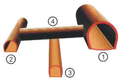 The geology of the undersea portion of the tunnel consists of volcanic rock, pyroclastic rock, and sedimentary rock of the Neogene period.[29] The area is folded into a nearly vertical syncline, which means that the youngest rock is in the centre of the strait and encountered last. Divided roughly into thirds, the Honshu side consists of volcanic rocks (notably andesite and basalt); the Hokkaido side consists of sedimentary rocks (notably Tertiary period tuff and mudstone); and the centre portion consists of Kuromatsunai strata (Tertiary period sand-like mudstone).[30] Igneous intrusions and faults caused crushing of the rock and complicated the tunnelling procedures.[28]