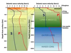 The propagation velocity of a seismic wave depends on density and elasticity of the medium as well as the type of wave. Velocity tends to increase with depth through Earth's crust and mantle, but drops sharply going from the mantle to Earth's outer core.[2]