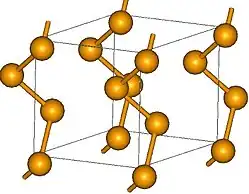 The most stable and dense form of selenium is gray and has a chiral hexagonal crystal lattice (space group 152 or 154 depending on the chirality)[21] consisting of helical polymeric chains, where the Se–Se distance is 237.3 pm and Se–Se–Se angle is 103.1°. The minimum distance between chains is 343.6 pm. Gray selenium is formed by mild heating of other allotropes, by slow cooling of molten selenium, or by condensing selenium vapor just below the melting point. Whereas other selenium forms are insulators, gray selenium is a semiconductor showing appreciable photoconductivity. Unlike the other allotropes, it is insoluble in CS2.[17] It resists oxidation by air and is not attacked by nonoxidizing acids. With strong reducing agents, it forms polyselenides. Selenium does not exhibit the changes in viscosity that sulfur undergoes when gradually heated.[16][22]