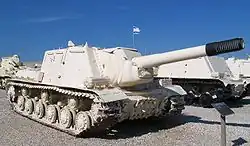 Heavily armoured assault guns were designed to provide direct-fire support to infantry in the face of enemy defenses. Although often similar to tank destroyers, they carried larger-caliber guns with weaker anti-armor performance but capable of firing powerful HE projectiles. The German 105 mm howitzer-armed StuH 42 based on the StuG III, and the immense 152 mm howitzer-armed, Soviet ISU-152, both fully casemated in their design, are examples of this type of self-propelled artillery.