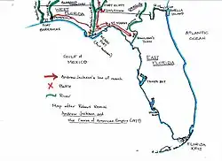 Jackson gathered his forces at Fort Scott in March 1818, including 800 U.S. Army regulars, 1,000 Tennessee volunteers, 1,000 Georgia militia,[86] and about 1,400 friendly Lower Creek warriors (under command of Brigadier General William McIntosh, a Creek chief). On 15 March, Jackson's army entered Florida, marching down the banks of the Apalachicola River. When they reached the site of the Negro Fort, Jackson had his men construct a new fort, Fort Gadsden. The army then set out for the Mikasuki villages around Lake Miccosukee. The Indian town of Anhaica (today's Tallahassee) was burned on 31 March, and the town of Miccosukee was taken the next day. More than 300 Indian homes were destroyed. Jackson then turned south, reaching Fort St. Marks (San Marcos) on 6 April.[87]
