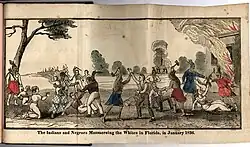 Beginning in the 1730s, Spain established a policy of providing refuge to runaway slaves from the British Southern Colonies. Hundreds of Black people escaped slavery to Florida over the ensuing decades, with most settling near St. Augustine at Fort Mose and a few living amongst the Seminole, who treated them with varying levels of equality.[7] Their numbers increased during and after the American War of Independence, and it became common to find settlements of Black Seminoles either near Seminole towns or living independently, such as at Negro Fort on the Apalachicola River.[8] The presence of a nearby refuge for free Africans was considered a threat to the institution of chattel slavery in the southern United States, and settlers in the border states of Mississippi and Georgia in particular accused the Seminoles of inciting slaves to escape and then stealing their human property.[9] In retaliation, plantation owners organized repeated raids into Spanish Florida in which they captured Africans they accused of being escaped slaves and harassed the Seminole villages near the border, resulting in bands of Seminoles crossing into U.S. territory to stage reprisal attacks.[10]