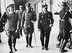 In the summer of 1934, Dietrich played a key role in the Night of the Long Knives. Hitler, along with Dietrich and a unit from the Leibstandarte, travelled to Bad Wiessee to personally oversee Ernst Röhm's arrest on 30 June. Later, at approximately 17:00 hours, Dietrich received orders from Hitler for the Leibstandarte to form an "execution squad" and go to Stadelheim prison, where certain Sturmabteilung (SA) leaders were being held.[11] There in the prison courtyard, the Leibstandarte firing squad shot six SA officers, including Edmund Heines.[12] Additional SA personnel identified by the regime as traitors were shot in Berlin by a unit of the Leibstandarte after Hitler told him to take six men and go to the Ministry of Justice to shoot certain SA leaders.[1][13] Shortly thereafter, Dietrich was promoted to SS-Obergruppenführer.[2] Dietrich's role later earned him an 18-month sentence from a postwar court.[14]