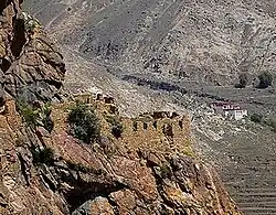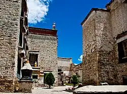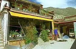 In the 1980s a citizen of Lhasa re-established the monastery under the Nyingma sect to remember his late mother.[28] After receiving permission from the Lhasa municipal government, he began renovating the site, although a former official of the Bari Lama's estate who had previously controlled the monastery initially objected to it being converted into Nyingma practice centre.[28] Today the hermitage, still partly ruined, consists of five major sections; a main temple compound around a central courtyard with a temple, kitchen, and some of the monks’ living quarters, an extensive ruined terraced complex just south of the main temple which before 1959 served as the meeting rooms and the living quarters of the workers and business managers of the Drakri Lama's estate, a building that had served as the living quarters for the eight fully ordained monks who formed the ritual core of the monastic community, a stable for mdzo, a yak-cow hybrid and several huts.[28] The main temple contains statues of Guru Rinpoche and several tantric deities and a three-dimensional model of Guru Rinpoche's celestial palace, the Glorious Copper-Coloured Mountain (Zangs mdog dpal ri).[28] Today there are four tantric priests residing in the main temple compound and two nuns living in huts to the southeast.[28]