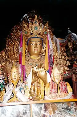 The entrance to the hall was through a portico built on 10 columns. Large appliqué Thangkas were suspended from the ceiling on the side walls. A skylight at the centre provided the light in the hall during the day. Image of the founder of the monastery Jamchen Choje Shakya Yeshe was deified as the central image. Other deities installed were of Maitreya (5 metres (16 ft) height and gilded) flanked by statues of two lions, Dalai Lamas V, VII and XII, Tsongkhapa (with his favourite disciples), Chokyi Gyeltsen, Desi Sangye Gyatso and many more.[16]
