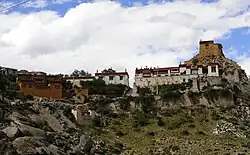 The site, which is over 1,300 years old, dates back to Songtsän Gampo, the founder of the Tibetan Empire, and was amongst the first buildings built in the Lhasa area by him during the 7th century after settlement.[24] Although originally the site of his castle or fort, the Tibetan Annals have revealed that Pabonka was converted into a monastery, possibly under the reign of the second great Buddhist king of Tibet Trisong Detsen. Detsen, along with Guru Rinpoche and the first seven monks of the new Tibetan Empire used to meditate at the hermitage and it became one of Tibet's very earliest Buddhist monasteries, possibly even pre-dating Jokhang.[24] The original nine-storied monastery was partially destroyed by King Langdharma in 841 AD during his campaign to destroy monastic Buddhism; it was rebuilt in the 11th century as a two-storied structure that housed 200 monks.[24][25]
