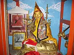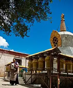 This temple is noted for its many shrines, and its blue and carved gold mantra in the hallway, inscribed with words meaning, "Hail to the jewel in the lotus".[24] A number of stone relics were buried during the Cultural Revolution but when Sera monks restored the hermitage they excavated the relics and restored most of them.[24] A central shrine, dating back 1300 years to Gampo, is located in the temple and depicts Chenresig, Jampelyang and Chana Dorje, the so-called "Rigsum Gompo Trinity" from which the temple takes its name.[24] Up the hill from the hermitage, past a group of chortens, is Palden Lhamo Cave, a cave known to have been a meditation chamber of Songstan Gampo himself and contains statues of himself, his two wives and a rock carving of Palden Lhamo, the protectress.[24]