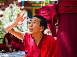 Debates are punctuated with vigorous gestures which enliven the ambience of the occasion. Each gesture has a meaning. The debater presents his case with subtlety, robed in a formal monk's attire. Some of the gestures (said to have symbolic value), made during the debates, generally subtle dramatic gestures are: clapping after each question; holding right hand and stretching left hand forward and striking the left palm with the right palm; clapping hands loudly to stress the power and decisiveness of the defender's arguments denoting his self-assurance; in case of wrong answer presented by the defender, the opponent gestures three circles with his hand around the defenders head followed by loud screaming to unnerve the defender; opponent's mistake is demonstrated by wrapping his upper robe around his waist; loud clapping and intense verbal exchange is common; and the approach is to trap the defender into a wrong line of argument. Each time a new question is asked, the teacher strikes his outstretched left palm with his right palm. When a question is answered correctly, it is acknowledged by the teacher bringing the back of his right hand to his left palm. When the defender wins the debate he makes an allegorical dig at the questioner by questioning his basic wisdom as a Buddhist.[49]