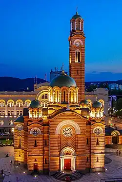 Bosnia and Herzegovina is rich in Serbian architecture, especially when it comes to numerous Serbian churches and monasteries, ranging from late medieval foundations (Tavna, Ozren, Tvrdoš, Žitomislić) to 19th- and 20th-century churches built in both the Baroque (such as the Cathedral of the Nativity of the Theotokos in Sarajevo and Cathedral of the Holy Trinity in Mostar) or Serbo-Byzantine style (such as the Cathedral of Christ the Saviour in Banja Luka and Hercegovačka Gračanica in Trebinje).[100][101] Many churches preserve valuable iconostases and frescoes; the treasury of the Church of the Holy Archangels Michael and Gabriel in Sarajevo is considered one of the five richest collections of Orthodox icons and liturgical objects in the world.[102]