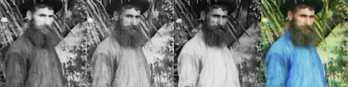 When the three color-filtered photographs were not taken at the same time, anything in the scene that did not hold steady during the entire operation would exhibit colored "fringes" around its edges in the resulting color image. If it moved continuously across the scene, three separate strongly-colored "ghost" images could result. Such color artifacts are plainly visible in ordinary color composites of many of Prokudin-Gorsky's photographs, but special digital image processing software was used to artificially remove them, whenever possible, from the composites of all 1,902 of the images commissioned by the Library of Congress in 2004.[20] The altered versions have proliferated online and older or third-party versions showing these tell-tale peculiarities are increasingly scarce.[21]