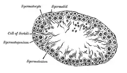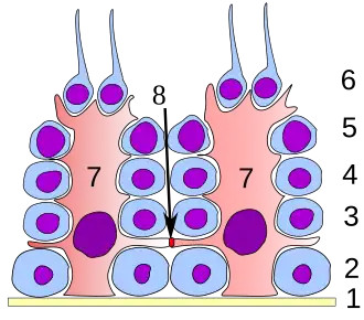 ![]() Germinal epithelium of the testicle. 1. basal lamina 2. spermatogonia 3. primary (1st-order) spermatocyte 4. secondary (2nd-order) spermatocyte 5. developing spermatid 6. mature spermatid 7. Sertoli cell 8. tight junction (blood-testis barrier) | |