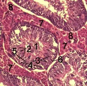 ![]() Histological section through testicular parenchyma of a boar. 1. lumen of Tubulus seminiferus contortus 2. spermatids 3. spermatocytes 4. spermatogonia 5. Sertoli cell 6. myofibroblasts 7. Leydig cells 8. capillaries | |