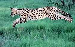 The serval locates prey by its strong sense of hearing. It remains motionless for up to 15 minutes; when prey is within range, it jumps with all four feet up to 4 m (13 ft) in the air and attacks with its front paws.[39] To kill small prey, it slowly stalks it, then pounces on it with the forefeet directed toward the chest, and finally lands on it with its forelegs outstretched. The prey, receiving a blow from one or both of the serval's forepaws, is incapacitated, and the serval bites it on the head or the neck and immediately swallows it. Snakes are dealt more blows and even bites, and may be consumed even as they are moving. Larger prey, such as larger birds, are killed by a sprint followed by a leap to catch them as they are trying to flee, and are eaten slowly. Servals have been observed caching large kills to be consumed later by concealing them in dead leaves and grasses. Servals typically get rid of the internal organs of rodents while eating, and pluck feathers from birds before consuming them. During a leap, a serval can reach more than 2 m (6 ft 7 in) above the ground and cover a horizontal distance of up to 3.6 m (11 ft 10 in). Servals appear to be efficient hunters; a study in Ngorongoro showed that servals were successful in half of their hunting attempts, regardless of the time of hunting, and a mother serval was found to have a success rate of 62%. The number of kills in a 24-hour period averaged 15 to 16. Scavenging has been observed, but very rarely.[24][21]