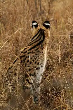 The coat is basically golden-yellow to buff and extensively marked with black spots and stripes.[21] The spots show great variation in size.[24] Facial features include the whitish chin, spots, and streaks on the cheeks and the forehead, brownish or greenish eyes, white whiskers on the snout and near the ears, which are black on the back with a white horizontal band in the middle; three to four black stripes run from the back of the head onto the shoulders and then break into rows of spots. The white underbelly has dense and fluffy basal fur, and the soft guard hairs (the layer of fur protecting the basal fur) are 5–10 cm (2.0–3.9 in) long. Guard hairs are up to 3 cm (1.2 in) long on the neck, back and flanks, and are merely 1 cm (0.39 in) long on the face.[23][26] The serval has a good sense of smell, hearing and vision.[23]