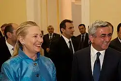 Sargsyan continued the policy towards the peaceful resolution of the Nagorno-Karabakh conflict pursued by his predecessors, which constitutes one of the main goals of the Armenian foreign policy.[38] Sargsyan repeatedly stated that the Armenian side is interested in finding a just and exclusively peaceful solution to the conflict and that the OSCE Minsk Group is the viable format within which the peace talks should continue.[39][40][41] He continued negotiations with Azerbaijan and had a number of meetings with the president of Azerbaijan within the framework of OSCE Minsk Group. On 2 November 2008, Ilham Aliyev and Serzh Sargsyan traveled to Moscow for talks with Dmitry Medvedev. The talks ended in the three Presidents signing a declaration confirming their commitment to continue talks.[42] The two presidents met again in 2009 in Saint Petersburg[43] and on 22 November 2009, together with several world leaders, in Munich where President Aliyev once more threatened to resort to military force to reestablish control over the region if the two sides did not reach an agreeable settlement.[44]