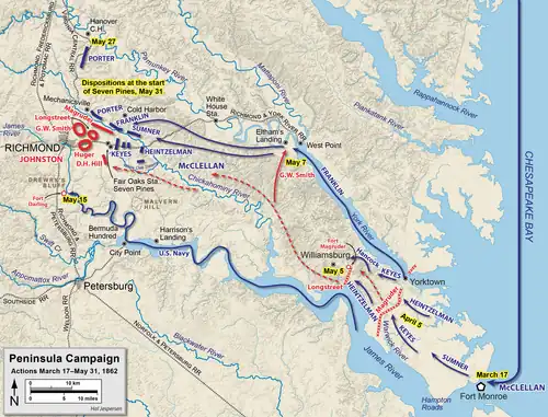 Map of events during the Peninsula campaign to the Battle of Seven Pines