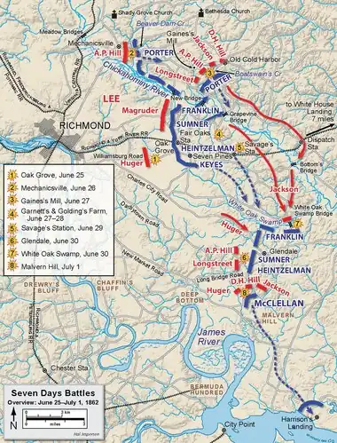 The Seven Days Battles were a series of seven battles over seven days from June 25 to July 1, 1862, near Richmond, Virginia, during the American Civil War. Confederate General Robert E. Lee drove the invading Union Army of the Potomac, commanded by Maj. Gen. George B. McClellan, away from Richmond and into a retreat down the Virginia Peninsula. The series of battles is sometimes known erroneously as the Seven Days Campaign, but it was actually the culmination of the Peninsula Campaign, not a separate campaign in its own right.