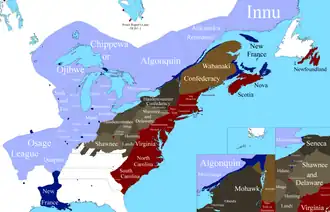 During the war, the Six Nations of the Iroquois Confederacy were allied with the British. Native Americans of the Laurentian valley—the Algonquin, the Abenaki, the Huron and others—were allied with the French. Although the Algonquin tribes living north of the Great Lakes and along the St. Lawrence River were not directly concerned with the fate of the Ohio River Valley tribes, they had been victims of the Iroquois Confederation which included the Seneca, Mohawk, Oneida, Onondaga, Cayuga and Tuscarora tribes of central New York. The Iroquois had encroached on Algonquin territory and pushed the Algonquins west beyond Lake Michigan and to the shore of the St. Lawrence.[106] The Algonquin tribes were interested in fighting against the Iroquois. Throughout New England, New York and the north-west, Native American tribes formed differing alliances with the major belligerents.
