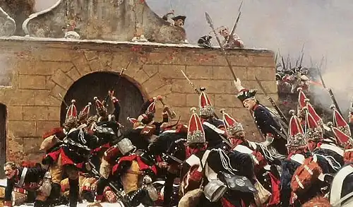 On the eastern front, progress was very slow. The Russian Army was heavily dependent upon its main magazines in Poland, and the Prussian Army launched several successful raids against them. One of them, led by general Platen in September resulted in the loss of 2,000 Russians, mostly captured, and the destruction of 5,000 wagons.[87] Deprived of men, the Prussians had to resort to this new sort of warfare, raiding, to delay the advance of their enemies. Frederick's army, though depleted, was left unmolested at its headquarters in Brunzelwitz, as both the Austrians and the Russians were hesitant to attack it. Nonetheless, at the end of 1761, Prussia suffered two critical setbacks. The Russians under Zakhar Chernyshev and Pyotr Rumyantsev stormed Kolberg in Pomerania, while the Austrians captured Schweidnitz. The loss of Kolberg cost Prussia its last port on the Baltic Sea.[88] A major problem for the Russians throughout the war had always been their weak logistics, which prevented their generals from following up their victories, and now with the fall of Kolberg, the Russians could at long last supply their armies in Central Europe via the sea.[89] The fact that the Russians could now supply their armies over the sea, which was considerably faster and safer (Prussian cavalry could not intercept Russian ships in the Baltic) than over the land threatened to swing the balance of power decisively against Prussia, as Frederick could not spare any troops to protect his capital.[89] In Britain, it was speculated that a total Prussian collapse was now imminent.