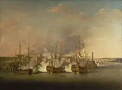 The British prime minister, the Duke of Newcastle, was optimistic that the new series of alliances could prevent war from breaking out in Europe.[45] However, a large French force was assembled at Toulon, and the French opened the campaign against the British with an attack on Minorca in the Mediterranean. A British attempt at relief was foiled at the Battle of Minorca, and the island was captured on 28 June (for which Admiral Byng was court-martialed and executed).[46] Britain formally declared war on France on 17 May,[47] nearly two years after fighting had broken out in the Ohio Country.