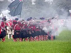 By this point Frederick was increasingly concerned by the Russian advance from the east and marched to counter it. Just east of the Oder in Brandenburg-Neumark, at the Battle of Zorndorf (now Sarbinowo, Poland), a Prussian army of 35,000 men under Frederick on 25 August 1758, fought a Russian army of 43,000 commanded by Count William Fermor.[78] Both sides suffered heavy casualties—the Prussians 12,800, the Russians 18,000—but the Russians withdrew after battle, and Frederick claimed victory.[79] The American historian Daniel Marston described Zorndorf as a "draw" as both sides were too exhausted and had taken such losses that neither wished to fight another battle with the other.[80] In the undecided Battle of Tornow on 25 September, a Swedish army repulsed six assaults by a Prussian army but did not push on Berlin following the Battle of Fehrbellin.[81]
