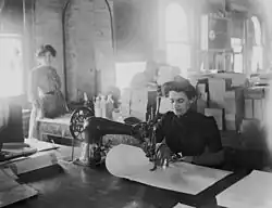 While much clothing was still produced at home by female members of the family, more and more ready-made clothes for the middle classes were being produced with sewing machines. Textile sweatshops full of poorly paid sewing machine operators grew into entire business districts in large cities like London and New York City. To further support the industry, piece work was done for little money by women living in slums. Needlework was one of the few occupations considered acceptable for women, but it did not pay a living wage. Women working from home often worked 14-hour days to earn enough to support themselves, sometimes by renting sewing machines that they could not afford to buy.[17]