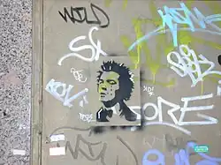 The Saint Martins gig was followed by performances at colleges around London. The band's core early followers—including Siouxsie Sioux, Steven Severin and Billy Idol, Jordan, and Soo Catwoman—came to be known as the Bromley Contingent, after the suburban south-east London borough that several of them were from.[45][46] Their cutting-edge fashion, much of it supplied by Sex, ignited a trend that was adopted by the new fans the band attracted.[47] McLaren and Westwood saw the incipient London punk movement as a vehicle for more than just couture. They were influenced by the May 1968 radical uprising in Paris, particularly by the ideology and agitations of the Situationists.[48][49][50] These interests were shared with Jamie Reid, a friend of McLaren who took over the design of the band's visual imagery in the spring of 1976.[51] His cut-up lettering—based on notes left by kidnappers or terrorists—were used to create the classic Sex Pistols logo and many subsequent designs for the band, although they were actually introduced by McLaren's friend Helen Wellington-Lloyd.[52][53][54] Reid has said that he used "to talk to John [Lydon] a lot about the Situationists ... the Sex Pistols seemed the perfect vehicle to communicate ideas directly to people who weren't getting the message from left-wing politics".[55] McLaren was also arranging for the band's first photo sessions.[56] According to the writer Jon Savage, Lydon "with his green hair, hunched stance and ragged look ...[Lydon] looked like a cross between Uriah Heep and Richard Hell".[24][note 1]