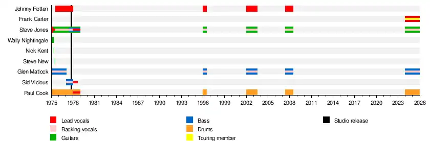 On 3 June 2024, Cook, Jones, and Matlock announced two reunion shows at the Bush Hall in Shepherds Bush billed as "Frank Carter and Sex Pistols". Carter, of Frank Carter & The Rattlesnakes and Gallows, provided lead vocals in the absence of Lydon.[239] They played the sole Sex Pistols studio album Never Mind the Bollocks, Here's the Sex Pistols in its entirety.[239] On 25 August they headlined along with Editors, the 2024 AMA Music Festival.[240] A UK tour was later announced for September 2024, which was officially billed as "Frank Carter and Paul Cook, Steve Jones, Glen Matlock of the Sex Pistols do Never Mind the Bollocks".[241] On 20 September they played the Rock City venue in Nottingham,[242] the next day the Birmingham o2 Academy [243] and on 26 September they played in London, Kentish Town.[244] On 12 November 2024, they were announced as part of the 2025 Download Festival lineup.[245] In January 2025, they announced their first Australian tour since 1996, which took place in April.[246] In October 2025, Glen Matlock revealed that the band have had "ideas" regarding new music with Carter, but were apprehensive about the reception that new music would receive among contemporary audiences.[247]