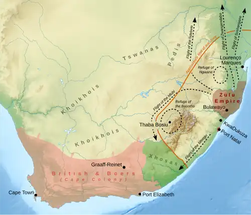 According to Julian Cobbing, the development of the view that Shaka was the monster responsible for the devastation is based on the need of apartheid era historians to justify the apartheid regime's racist policies.[45] Other scholars acknowledge distortion of the historical record by apartheid supporters and shady European traders seeking to cover their tracks, but dispute the revisionist approach, noting that stories of cannibalism, raiding, burning of villages, or mass slaughter were not developed out of thin air but based on the clearly documented accounts of hundreds of black victims and refugees. Confirmation of such accounts can also be seen in modern archaeology of the village of Lepalong, an entire settlement built underground to shelter remnants of the Kwena people from 1827 to 1836 against the tide of disruption that engulfed the region during Shakan times.[46]