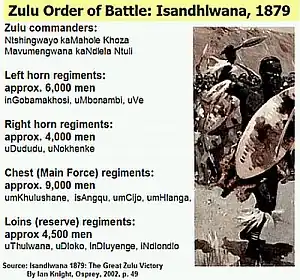 - The main force, the "chest," closed with the enemy impi and pinned it in position, engaging in melee combat. The warriors who formed the "chest" were senior veterans.[27]