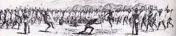 The story that sandals were discarded to toughen the feet of Zulu warriors has been noted in various military accounts such as The Washing of the Spears, Like Lions They Fought, and Anatomy of the Zulu Army. Implementation was typically blunt. Those who objected to going without sandals were simply killed.[23] Shaka drilled his troops frequently, in forced marches that sometimes covered more than 80 kilometres (50 mi) a day in a fast trot over hot, rocky terrain.[23][24] He also drilled the troops to carry out encirclement tactics.