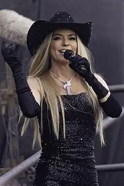 She competed against singer Meghan Trainor in an episode of TBS's Drop the Mic which aired in January 2018.[129] She was guest of honour for a Lip Sync Battle episode on Paramount Network pitting Derek Hough against Nicole Scherzinger that was dedicated to her and her music. The tribute episode aired June 21, 2018.[130] In November 2018 she appeared in the reality talent show Real Country, as an executive producer and co-presenter with Jake Owen and Travis Tritt.[131] In 2019 she appeared in the film Trading Paint, co-starring alongside John Travolta. In 2020 she played the role of the mother of singer Jeremy Camp in the biographical film I Still Believe.[132] In 2023, she appeared on the panel for the second series of ITV's Starstruck, a revived and reformatted version of Stars in Their Eyes, replacing Sheridan Smith.[133] In 2023 she appeared in season four, episode seven of the reality series The Kardashians.[134] In 2024 she appeared on the first episode of the Netflix series A Man in Full,[135] a six-episode limited television series adaptation of the novel with Regina King as director and executive producer and David E. Kelley as showrunner. The miniseries was released on May 2, 2024.[136] She guest starred in an episode of the ABC medical drama, Doctor Odyssey which aired on October 3, 2024. She appeared in Andrea Bocelli: 30 The Celebration Concert Film, which released in theaters on November 8, 2024. Shania guest starred in 'A Nonsense Christmas with Sabrina Carpenter' on December 6, 2024, as part of the Netflix special, Shania played Mrs Claus in a skit and performed Santa Baby with Sabrina Carpenter. In 2025, she became a judge on the fifth season of Canada's Got Talent.