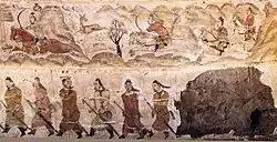 Wall painting from the Jiuyuangang Tomb in Xinzhou, 6th century CE, depicting mounted hunting scenes from the Northern Wei.