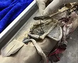 Digestion can take a long time. The food moves from the mouth to a J-shaped stomach, where it is stored and initial digestion occurs.[53] Unwanted items may never get past the stomach, and instead the shark either vomits or turns its stomachs inside out and ejects unwanted items from its mouth.[54]