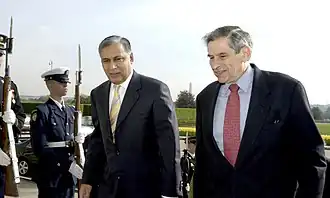 Relations with Israel were considered important by Aziz's government, and supported Musharraf's policy on Israel.[65] At foreign fronts, Aziz maintained a "Telephone Policy"[66] on diplomatic engagement with Israel, whilst keeping Saudi Arabia and Turkey in tacit contact.[66][67] During his tenure, bilateral relations with the United Kingdom were enhanced and reached to a new level after meeting with British prime minister Tony Blair in 2005, and tightened the economic and defence relations with British counterpart Gordon Brown in 2007.[68] Brown thanked Aziz for the successful launching of a $500 million Eurobond, which was oversubscribed four times.[69] After assuming the office of prime minister, Aziz left for China, as his foreign state visit as prime minister in 2004.[70] In 2007, Aziz made his final state visit as prime minister to China to sign a Free Trade Agreement[71] with China, and regarded the country as a "strategic partner"[72] and a "time-tested friend",[72] whilst China regarded the FTA agreement as "a historic development".[72] Aziz built closer economic ties with India while alleviating the territorial conflicts. After meeting with Indian counterpart Manmohan Singh, a confident measuring building process was initiated by Aziz.[73]