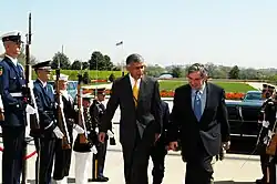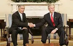 Aziz paid a farewell visit to South Korea to strengthen and enhance relations between the two countries.[61] Aziz cautiously supported South Korea's stance while refraining to criticise North Korea.[61] On a three-day state visit, Aziz and his counterpart Lee Hae Chan signed two agreements on cultural exchange and providing human resource management, and improving trade and cultural ties between South Korea and Pakistan.[61] Aziz strongly allied with the United States in the fight against terrorism, and in a meeting with an American journalist, Aziz maintained that: "Pakistan is now ideally positioned to "work with cooperation rather than confrontation as a force for peace, stability, and prosperity."[62] During his tenure, relations with the United States strengthened and progressed.[63] In 2006, Aziz quoted: "Pakistan-American relations are based on mutual trust and respect and are long-standing."[63] During his repeated visits to the United States, Aziz worked and deliberately approached the U.S. administration on building a strategic partnership with the United States, and made efforts to build a "robust-broad-based strategic relationship".[64] Aziz's economic, domestic, and internal reforms focused on enriching a longer-term sustainable Pakistan-U.S. relationship and contributed immeasurably to both countries' joint struggle against extremism.[64]