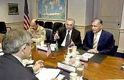 After the 11 September attacks in the United States and Pakistan's role in the war on terror, Aziz travelled to the United States in order to negotiate a relief and U.S. aid to Pakistan.[9] He closely worked with US Secretary of the Treasury on the detail of the devised plan on how to remove the Taliban from Afghanistan, cancellation and debt relief, loans from the World Bank, and direct support from U.S. Aid for national public development.[9] Aziz recommended policies and new plan of economic reforms, including the improved budgetary transparency and spending controls— a plan that was widely accepted by the United States.[9] With the help from United States Department of the Treasury, Aziz thwarted individuals, difficulties and obstacles to achieve success in his economic programmes.[9] In 2002, Aziz worked with U.S. administration to help advise the United States to finance the war in Afghanistan.[9] In the words of John B. Taylor, Aziz suggested that U.S. should call out for a meeting of finance ministers of the G7 member countries, where the illicit funding of money would become a great problem for G7 countries in the future.[9] In April 2002, Aziz chaired a historical meeting on behalf of Pakistan and the United States, helping the G7 members to understand how the illicit money was transferred was shared with the finance ministers of G7 members and Pakistan on other side.[9]
