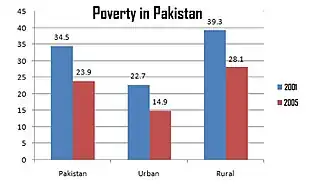 Aziz successfully oversaw the rapid development of the local government system in Pakistan as part of his "Strengthening Decentralisation" program.[28] His domestic initiatives including the decentralisation in the country, and termed the local government system as "more transparent and accountable".[28][29] Aziz strengthened the policy formats and area of responsibility of National Reconstruction Bureau (NRB) after appointing Daniyal Aziz in 2005.[29] In 2005, Aziz's government installed 6,000 water supply and sanitation filter plants through the Khushal Pakistan (lit. Prospered Pakistan) programme, a scheme founded by Nawaz Sharif in the 1990s.[30] As prime minister, Aziz took hard stance against rivals and took a hardline against his political challengers.[31] Aziz thrashed the Alliance for Restoration of Democracy (ARD) led by conservative leader Javed Hashmi who was placed in military prison on treason charges, on a support provided by Aziz.[31] His hardline and tough counter active measures forced Pakistan Peoples Party of Benazir Bhutto and Pakistan Muslim League-N of Nawaz Sharif to concede their defeat and took asylum in United Kingdom.[31]