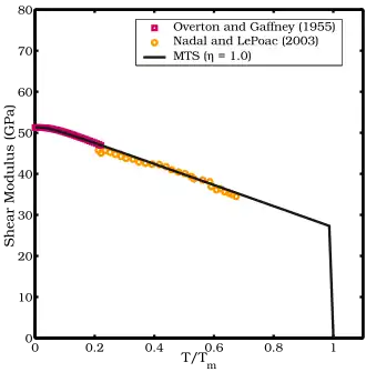 - ^ a b Nadal, Marie-Hélène; Le Poac, Philippe (2003). "Continuous model for the shear modulus as a function of pressure and temperature up to the melting point: Analysis and ultrasonic validation". Journal of Applied Physics. 93 (5): 2472. Bibcode:2003JAP....93.2472N. doi:10.1063/1.1539913.