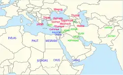 The 1st-century historian Flavius Josephus told a legendary, non-scriptural account that Shem's five sons were the progenitors of the nations of Elam, Assyria, Chaldea, Lydia, and Levantine, respectively.[10]