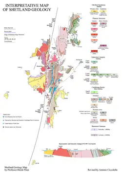 The geology of Shetland is complex, with numerous faults and fold axes. These islands are the northern outpost of the Caledonian orogeny, and there are outcrops of Lewisian, Dalradian and Moine metamorphic rocks with histories similar to their equivalents on the Scottish mainland. There are also Old Red Sandstone deposits and granite intrusions. The most distinctive feature is the ophiolite in Unst and Fetlar which is a remnant of the Iapetus Ocean floor made up of ultrabasic peridotite and gabbro.[29]