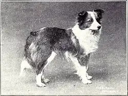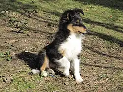 Unlike many miniature breeds that resemble their larger counterparts, this breed was not developed simply by selectively breeding the Rough Collie for smaller and smaller size. The original sheepdog of Shetland was a Spitz-type dog, probably similar to the modern Icelandic Sheepdog. Strong evidence suggests that this dog was bred with the Yakki, an Icelandic dog that accompanied whalers from Greenland who landed in the ports of the island. The Yakki was about 14 inches (36 cm) in height and usually black with tan or white markings. Many of the early Shetlands were black and white or black and tan and this colouring can still be see in the muzzle of some sable dogs today whose muzzles are referred to as "smutty muzzles". Folk tales also mention a King Charles Spaniel that came from a yacht. Pomeranian dog ancestry is likely given the appearance of the breed. The first club for the breed called for a dog similar to the Rough Collie except in size, the standard called for dogs to be no taller than 15 inches (38 cm). Other clubs called for similar standards with the breed to essentially be a miniature. These standards led to people adding in collie blood to the breed to achieve said type. The Kennel Club originally refused to recognise the breed but later agreed to on the condition the name was changed from Shetland Collie due to opposition from collie breed clubs.[1] The original Spitz-type working sheepdog of Shetland is now extinct, having been replaced for herding there by the Border Collie. Shetlands were used for herding until commercial livestock farming required larger breeds.[3]